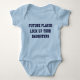 Warn those parent of little girls early that you have a potential player around, with this fun baby boy's one piece crawler suit. Blue block text reads, Future Player Lock Up Your Daughters. Chose size and color you like best.