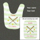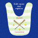 This cute baby bib with a sporting theme has a design featuring crossed softball bats with three yellow softballs, and is ready for you to personalize with your baby's name in red. The accompanying caption is simply "Future softball star" or you can customize this too - perhaps add the name of your favorite team. The background has broad green and white stripes.