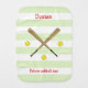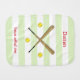 This burp cloth has a design featuring crossed softball bats with three yellow softballs, and is ready for you to personalize with your baby's name. The accompanying caption is simply "Future softball star" or you can customize this too. The background has broad green and white stripes. On the back side of the cloth there is a repeating geometric pattern of softballs on a white background.