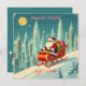 Invite friends and family to your holiday celebration with this Secret Santa Gift Exchange invitation featuring a whimsical scene of cartoon Santa Claus skiing down a hill in his sleigh, delivering presents against a futuristic city skyline. The torn-edge vintage background contrasts beautifully with the modern, sleek buildings, giving the design a unique retro-futuristic holiday vibe. Perfect for office parties, family gatherings, or festive friend get-togethers. Customize easily with your event details on both sides.