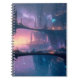 Futuristic cityscape with towering structures and interconnected platforms, reflecting in a body of water. The color palette is dominated by blues and purples, with hints of orange and pink from the setting sun. The city is illuminated with numerous lights, creating a vibrant and dynamic atmosphere.