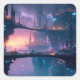 Futuristic cityscape with towering structures and interconnected platforms, reflecting in a body of water. The color palette is dominated by blues and purples, with hints of orange and pink from the setting sun. The city is illuminated with numerous lights, creating a vibrant and dynamic atmosphere.