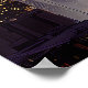 Massive floating structures hover above a sprawling cityscape, enveloped in misty clouds. The scene is set during a serene sunset, casting a warm glow.