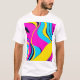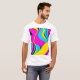 This T-shirt design features a bold and modern abstract pattern combining vibrant geometric shapes with flowing lines. The design incorporates bright, neon colors like electric blue, neon pink, and sunny yellow, creating a dynamic and energetic feel. A subtle gradient and textured layers add depth, giving the artwork a futuristic yet playful vibe. Perfect for anyone seeking a stylish, eye-catching look that blends modern aesthetics with a fun, youthful spirit.