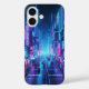 futuristic neon cityscape, streets illuminated with bright blue and purple lights in cyberpunk style, holographic signs, minimalist and stylish design, vertical format