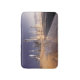 The image showcases a futuristic cityscape rising from a desert landscape. Tall, modern skyscrapers with reflective surfaces dominate the horizon, illuminated by a warm, golden light. The foreground features sand dunes with subtle ripples and a body of water reflecting the city's skyline. The sky transitions from a deep blue to a soft, pastel hue near the horizon.