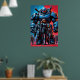A group of sci-fi soldiers in advanced armor stand before a colossal blue robot in a futuristic cityscape with a red and blue split background. Clear details and vibrant colors enhance visual appeal.