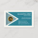 Card features a Cyan colored triangle and polygon design. Over at the top lies your prestigious name and job title alongside a slogan option near the center. Towards the base are the contact details housed by triangle buttons. A gold logo and its business name is attached to the triangle on the left face.