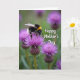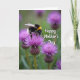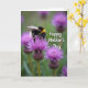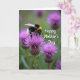 This Mother's Day card features a close-up nature scene with a fuzzy, plump insect marked by black and golden-yellow bands and a soft white tip, resting gently on a rich purple flower as if leaning in for a quiet, affectionate moment ❤️. The flower’s thin, spiky filaments spread outward like a small burst, framing the insect in a way that feels tender and attentive. Fine details stand out, including translucent wings with visible veins and slender antennae angled toward the flower as it searches for nectar. Behind them, the background fades into a soft blur of green leaves and muted purple tones, keeping the focus on the intimate interaction in the foreground. Light falls evenly across the scene, giving the insect’s fuzzy texture and the flower’s delicate spikes a calm, glowing look. Near the top, the words “Happy Mother’s Day” appear in small white lettering that sits lightly over the blurred background, easy to read without overpowering the image 🌼. Deep greens, amethyst purples, and warm yellow stripes create a rich color contrast that guides your eye back to the insect and bloom. The purple flower sits slightly off-center, with its filaments radiating outward beneath the insect’s wings.