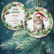 Here's an adorable ornament for a daughter, granddaughter, or niece that is personalized for her. The front image is of a cute fuzzy tiger striped kitten wearing a red and white Santa Claus hat. The kitten sits within a pretty holly and red berry Christmas wreath. The back of the ornament has the same wreath image with your custom text in green and red. She will love it!