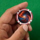 A spiral galaxy with major arms in hues of red and yellow like they are glowing with fire. Lesser arms of bright blue-white star clusters intertwined.
