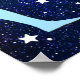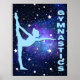 Galaxy Gymnastics design with white stars, milky way, light powder blue female gymnast silhouette and says gymnastics in vertical form.