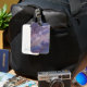 Luggage tag with blue and purple galaxy with scattered white stars. Original artwork by Ray Bean is watercolor on watercolor paper.