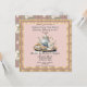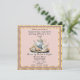 A pretty teacup, piece of cake and flowers complete the pretty invitation encircled in a gold color square frame.