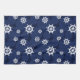 Modern navy blue and white nautical ship's wheel patterned towel, perfect for the galley kitchen. Big white ship's wheels patterned over a background of circles, in deep blue colours.