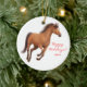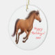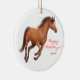 Original fine art design of a galloping bay Thoroughbred horse by illustrator/designer Carolyn McFann of Two Purring Cats Studio on a quality and customizable Christmas holiday ornament for equine fans.