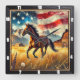 Celebrate American pride with this patriotic wall clock featuring a galloping horse, rustic barn setting, and USA flag elements. Perfect for farmhouse charm and western-style interiors, this timepiece blends traditional values with artistic wildlife design. A bold, stylish decor piece for home or ranch-style living spaces.