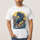 This galloping horse T-shirt design captures the essence of speed and freedom with a stunning portrayal of a horse in full stride. The horse is depicted with dynamic lines and intricate shading, emphasizing its powerful muscles and flowing mane that trails behind in the wind. The design features a blend of earthy and metallic colors, giving the horse a lifelike appearance while adding an artistic, almost mythical aura. Dust clouds at the hooves and a faint horizon line suggest movement across open landscapes, symbolizing unbridled spirit. Perfect for horse lovers, this T-shirt design celebrates nature’s raw beauty and untamed energy.