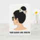This design shows a stylish woman in right-facing profile against a plain white background, her dark hair swept into a full bun that feels carefully arranged for a special day. A large white bow sits in her hair, patterned with green shamrocks and small orange flowers ☘️. She wears black-framed sunglasses, and the lenses shift from emerald green into warm orange, like a sunset gradient that mirrors Irish colors 💚. A slim gold drop earring made of simple geometric shapes hangs at her ear, adding a soft touch of polish. A faint pink blush on her cheek suggests she’s reacting to someone close by, as if catching a fond look without turning her head. Centered beneath the portrait, the phrase “YOUR GALWAY GIRL FOREVER” appears in uppercase black lettering, standing out sharply on the white space. The bow’s shamrock-and-orange pattern is the most detailed element, drawing your eye right back to the top of her bun.