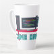 Game developer latte mug with game developer workstation. Game Developer in blue pixel font.