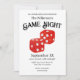 These custom party invitations feature a Game Night theme. An image of playing dice are printed in the center in a red glitter design. The phrase "Game Night" is printed above the dice with a sample family name. You can personalize the game party invitations to include your own custom name or text.