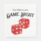 These custom party napkins feature a Game Night theme. An image of playing dice are printed in the center in a red glitter design. The phrase "Game Night" is printed above the dice with a sample family name. You can personalize the napkins to include your own custom name or text.