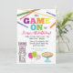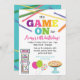 Our original, best-selling, Game On Arcade pizza birthday party invitation is the perfect invite for any game theme party with an arcade, laser tag or pizza theme. This design features colorful letters with fun arcade game, balloons and pizza graphics.