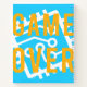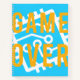 This graphic boldly captures the phrase "GAME OVER" set against a vibrant blue background, intertwined with an abstract, circuit board-inspired design in white. The design's high-contrast, bold yellow letters grab attention, while the intricate circuit lines evoke the essence of digital technology and gaming. This visual interplay between text and circuitry not only appeals to gamers but also creatively symbolizes the end of a digital journey or game. This image would be perfect for gaming related content, apparel, or even as a stylish poster for a gaming room.