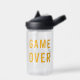 This graphic boldly captures the phrase "GAME OVER" set against a vibrant blue background, intertwined with an abstract, circuit board-inspired design in white. The design's high-contrast, bold yellow letters grab attention, while the intricate circuit lines evoke the essence of digital technology and gaming. This visual interplay between text and circuitry not only appeals to gamers but also creatively symbolizes the end of a digital journey or game. This image would be perfect for gaming related content, apparel, or even as a stylish poster for a gaming room.