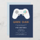 Fun game theme invitation for bachelor parties or bachelor party weekends features a game controller with "game over" and your party details in retro digital lettering.