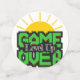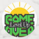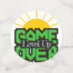 Game Over is depicted in bold, pixelated lettering, with the words “Level Up” creatively superimposed on it in an ornate script at its center and a sun shining behind it at the top. The design blends retro gaming aesthetics with an uplifting twist.