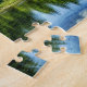 Game puzzle shown with a photo print of a beautiful mountain lake scene. Customize this item or buy as is. Stock Image