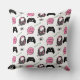 Gaming themed pillow with pink, gray and black graphics such as headphones, controllers and text level up.