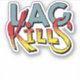 Cool gaming joke design with "Lag kills" quote. The letters are made with black shadow, lag is blue, kills is yellow with red splashes.