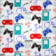 Cute gamer themed pattern with console controllers and fun game icons in blue, red black and white, ideal for kids projects and makes.