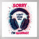The image features a stylized illustration of a pair of gaming headphones against a white background. The headphones are make in a bold, cartoonish style with vibrant colors, including blue, pink, and black. The headphones are depicted with a microphone attached, and the earcups are large and circular.