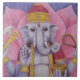 A ceramic tile with my 18" square watercolor pencil painting of Ganesh. Ganesh is a Hindu god. He is the remover of obstacles, patron of arts and sciences, the lord of intellect and wisdom, the god of beginnings, and patron of letters and learning. He holds his own broken tusk in his lower-right hand and holds a delicacy, in his lower-left hand. In one upper arm, he holds an ax, and in the other upper arm, a noose. I have placed him seated in front of a pink lotus flower, as part of a symbol of new beginnings unfolding.