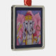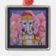 An ornament with my 18" square watercolor pencil painting of Ganesh. Ganesh is a Hindu god. He is the remover of obstacles, patron of arts and sciences, the lord of intellect and wisdom, the god of beginnings, and patron of letters and learning. He holds his own broken tusk in his lower-right hand and holds a delicacy, in his lower-left hand. In one upper arm, he holds an ax, and in the other upper arm, a noose. I have placed him seated in front of a pink lotus flower, as part of a symbol of new beginnings unfolding.