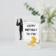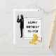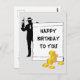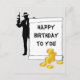 Image of a gangster with a machine gun in one hand. He holds a message paper in another hand. The message says as follows: HAPPY BIRTHDAY TO YOU. An image of a pile of golden coins at the bottom. Funny postcard for anyone. Customizable. You can change an image and you can change a text on the front and on the back of the card.