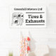 Tire sales business. Garage banner. Car servicing, tires, exhausts, and vehicle repairs. Black and white.