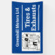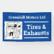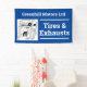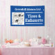Garage banner. Car servicing, tires, exhausts, and vehicle repairs. Blue and white.