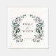 Personalized napkin featuring your names and special date, framed by watercolored leaves and florals in blue and pink hues.