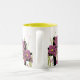 Elevate your coffee or tea experience with this charming ceramic mug, meticulously designed with vibrant pink flowers featuring sunny yellow centers. Surrounded by lush green stems and leaves, the floral pattern is perfectly contrasted against a sleek black fence backdrop, making this mug a true statement piece. The interior boasts a bright yellow lining that not only complements the exterior design but also adds a cheerful pop of color to your drinkware collection. Resting gracefully on a clean, white surface, this mug is not just a functional item but also a delightful artwork that brings a touch of nature into your home or office.