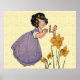 Celebrate the Spring with this lovely image of a sweet little garden Elf and its flowers. From a vintage postcard from 1919, originally an Easter card, this sweet little card shows a beautiful young girl with dark hair, purple dress, and flowers in her hair, accepting a tiny little daffodil from a little garden fairy she finds amongst the daffodil flowers. The Little fairy holds up the flower to her. He is standing on top of a little daffodil as he reaches the little flower to her outstretched hands. What a beautiful vintage fairy easter gift for your loved one! The card has a lovely yellow pattern background, which sings of Spring and new life!