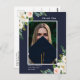Elegant blush pink and white garden floral and greenery arrangements, graduation thank you postcard. Card features, navy blue background color and single front framed photo.