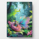 A tiny girl and a butterfly with iridescent wings perched on a giant flower in a lush jungle, accompanied by a colorful toucan. Large leaves and vibrant flowers surround them, creating a magical, whimsical scene. Digital Art