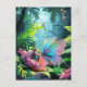 A tiny girl and a butterfly with iridescent wings perched on a giant flower in a lush jungle, accompanied by a colorful toucan. Large leaves and vibrant flowers surround them, creating a magical, whimsical scene. Digital Art