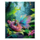 A tiny girl and a butterfly with iridescent wings perched on a giant flower in a lush jungle, accompanied by a colorful toucan. Large leaves and vibrant flowers surround them, creating a magical, whimsical scene. Digital Art