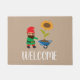 A fun garden gnome theme welcome mat featuring a garden gnome with a wheelbarrow customisable colored background with welcome sign. A homely, colorful garden art good chi welcome door mat perfect for your house.
