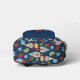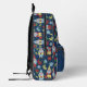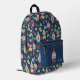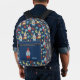 This patterned backpack has a retro modern style with illustrations of cute garden gnomes with white beards set against a navy blue background and surrounded by flowers in red, yellow and light blue on green stems. There's a spot on the front pocket to personalize this backpack with your own monogram initials in light blue lettering.